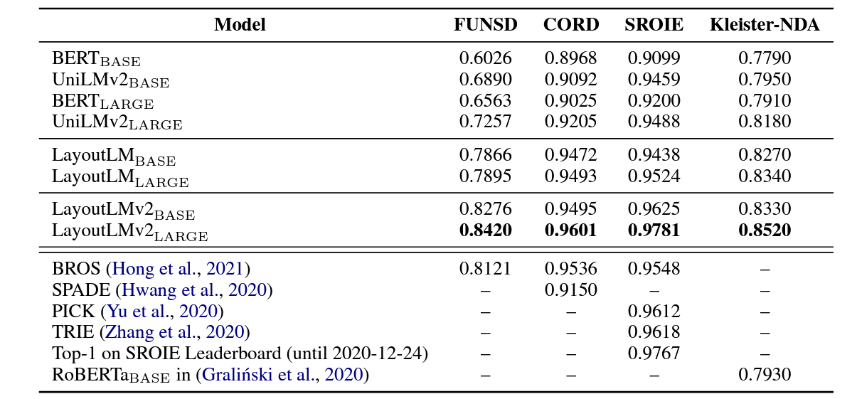 - LayoutLM v1에 비해 다양한 작업에서 큰 성능 향상을 보여줌.
