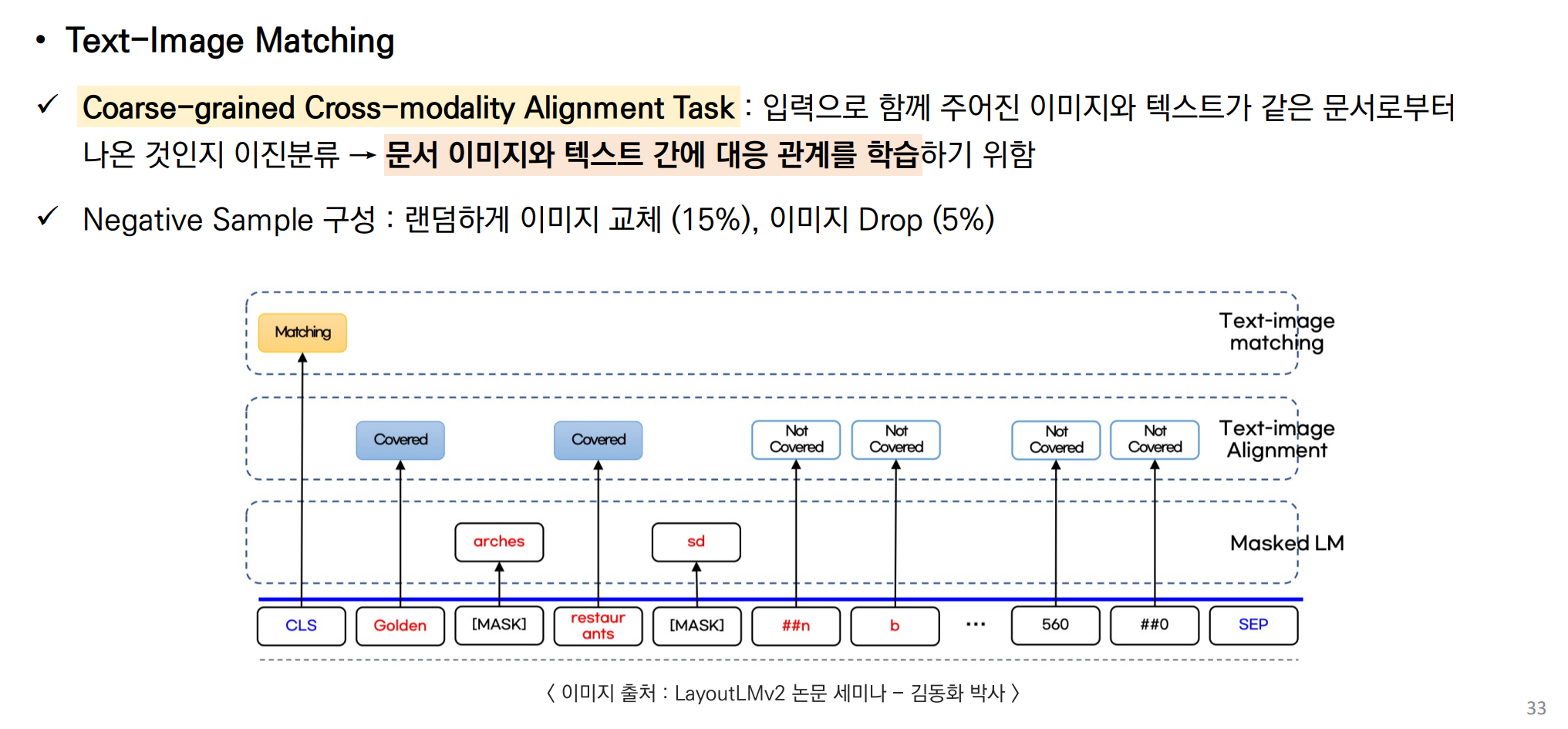 - 텍스트-이미지 매칭 (Text-Image Matching): 문서 이미지와 텍스트 내용이 관련이 있는지 학습.