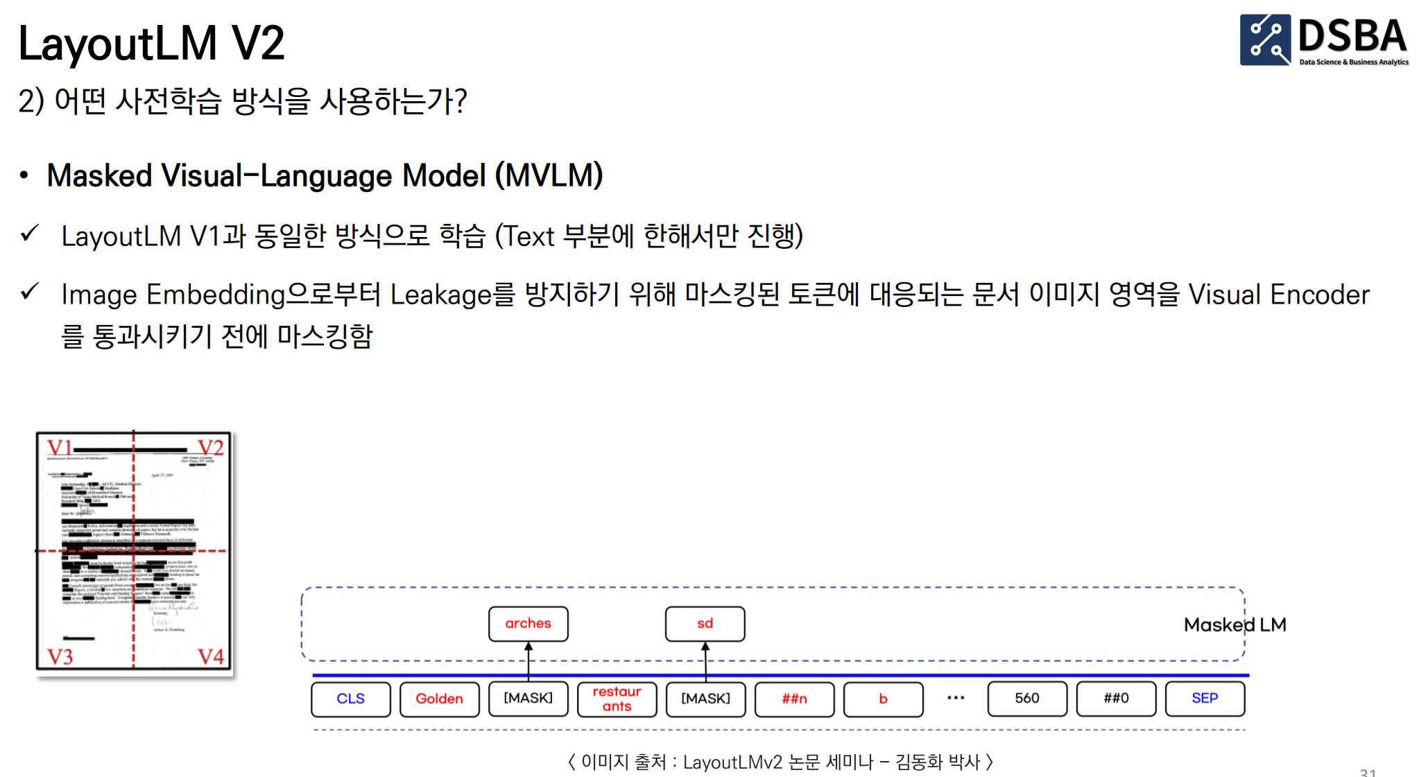 | Masked Visual-Language Modeling (MVLM) | 언어 모델링과 시각적 정보의 상호 작용을 통해 모델의 언어 이해 능력 향상 | - 일부 텍스트 토큰을 마스킹하여 모델이 이를 복원하도록 학습 - 텍스트와 레이아웃 정보를 통합하여 텍스트의 위치를 인식 |
