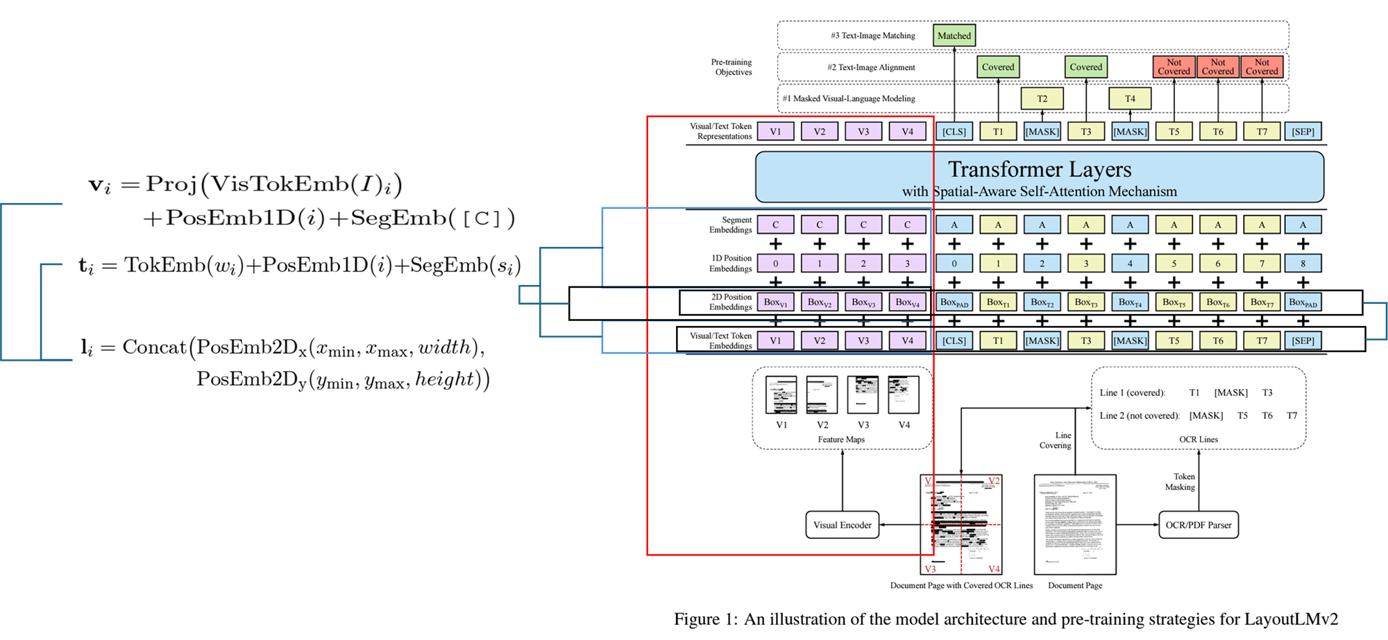 Layout v1 에서는 BERT 와 같은 아키텍처에서 텍스트만 받는 것에서 문서 레이아웃에서 시각적으로 풍부한 정보를 활용하고 이를 입력 텍스트와 정렬하는 방안을 제안합니다.