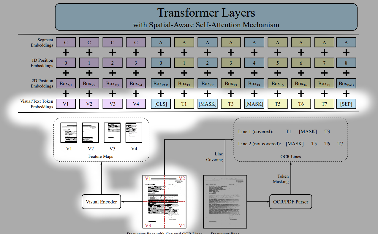 - Masked Visual-Language Modeling (MVLM): 일부 입력 토큰을 무작위로 마스킹하고 해당 2D 위치 임베딩을 유지하여 언어 및 시각 정보를 학습.