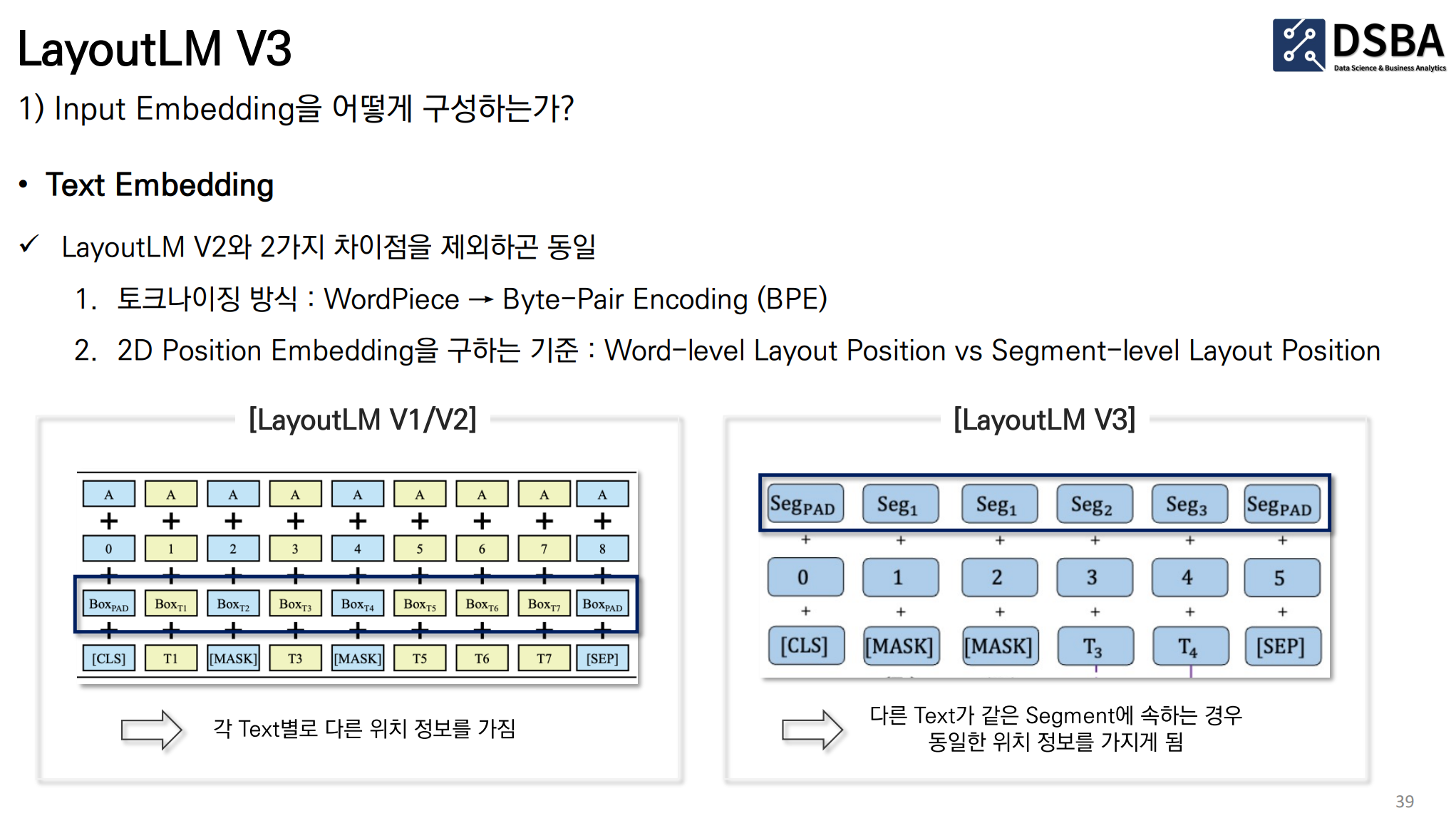 | 레이아웃 임베딩 | - 정의: 축 정렬 토큰 바운딩 박스를 사용 - 구성 요소: x축과 y축 특징을 개별적으로 임베딩 |