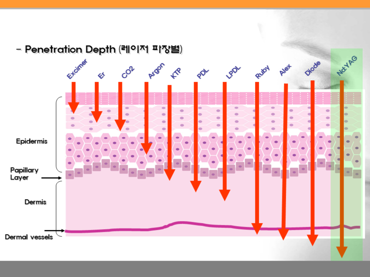 ![]() | The image appears to be a screenshot of a presentation slide, possibly from an academic or research presentation. It features a graphical representation of a scientific concept related to the human body, specifically focusing on the skin and its layers. At the top of the slide, there is text in Korean that translates to "Penetration depth." This suggests that the slide is discussing how deep substances can penetrate into the skin. Below this title, there's a diagram with several layers labeled in English: "Epidermis," "Papillary dermis," "Reticular dermis," and "Hypodermis." These labels indicate the different layers of the skin from the outermost layer (epidermis) to the deepest layer (hypodermis). The diagram is color-coded, with each layer represented by a different color. The epidermis is shown in pink, the papillary dermis in blue, the reticular dermis in green, and the hypodermis in red. This color coding helps to distinguish between the layers. On the right side of the slide, there are annotations with arrows pointing downwards into the diagram. These arrows seem to indicate the depths at which certain substances can penetrate: "Penetration depth," "Epidermis," "Papillary dermis," and "Reticular dermis." The arrows suggest that these substances can penetrate up to the reticular dermis layer. The bottom of the slide shows a graph with a pink line representing the concentration of a substance in the skin, which increases as it penetrates deeper into the layers. This graph is likely used to illustrate how the concentration of the substance changes with depth. Overall, the slide seems to be educational or informative, aiming to explain the concept of skin penetration and the depths at which substances can reach within the skin's layers. The use of color coding and annotations helps to clarify the information presented in the diagram. | 이미지는 학술 또는 연구 프레젠테이션의 프레젠테이션 슬라이드 스크린샷인 것으로 보입니다. 인체와 관련된 과학적인 개념, 특히 피부와 그 층을 중심으로 그래픽으로 표현한 것이 특징입니다. 슬라이드 상단에는 "침투 깊이"로 번역되는 한국어 텍스트가 있습니다. 이는 슬라이드에서 물질이 피부 속으로 얼마나 깊이 침투할 수 있는지에 대해 논의하고 있음을 시사합니다. 이 제목 아래에는 영어로 "Epidermis", "Papillary dermis", "Retular dermis" 및 "Hypodermis"라는 라벨이 붙은 여러 레이어가 있는 다이어그램이 있습니다. 이 라벨은 가장 바깥층(표피)부터 가장 깊은 층(피하)까지 피부의 다양한 층을 나타냅니다. 다이어그램은 색상으로 구분되어 있으며 각 레이어는 서로 다른 색상으로 표시됩니다. 표피는 분홍색, 유두 진피는 파란색, 망상 진피는 녹색, 피하 진피는 빨간색으로 표시됩니다. 이 색상 코딩은 레이어를 구별하는 데 도움이 됩니다. 슬라이드 오른쪽에는 다이어그램 아래쪽을 가리키는 화살표가 있는 주석이 있습니다. 이 화살표는 "침투 깊이", "표피", "유두 진피" 및 "망상 진피"와 같이 특정 물질이 침투할 수 있는 깊이를 나타내는 것으로 보입니다. 화살표는 이러한 물질이 망상 진피층까지 침투할 수 있음을 나타냅니다. 슬라이드 하단에는 피부 내 물질의 농도를 나타내는 분홍색 선이 있는 그래프가 표시되어 있으며, 피부층 깊숙이 침투할수록 농도가 증가합니다. 이 그래프는 물질의 농도가 깊이에 따라 어떻게 변하는지를 설명하는 데 사용될 가능성이 높습니다. 전반적으로 이 슬라이드는 피부 침투의 개념과 피부층 내에서 물질이 도달할 수 있는 깊이를 설명하는 것을 목표로 하는 교육적이고 유익한 것으로 보입니다. 색상 구분과 주석을 사용하면 다이어그램에 표시된 정보를 명확하게 하는 데 도움이 됩니다. |