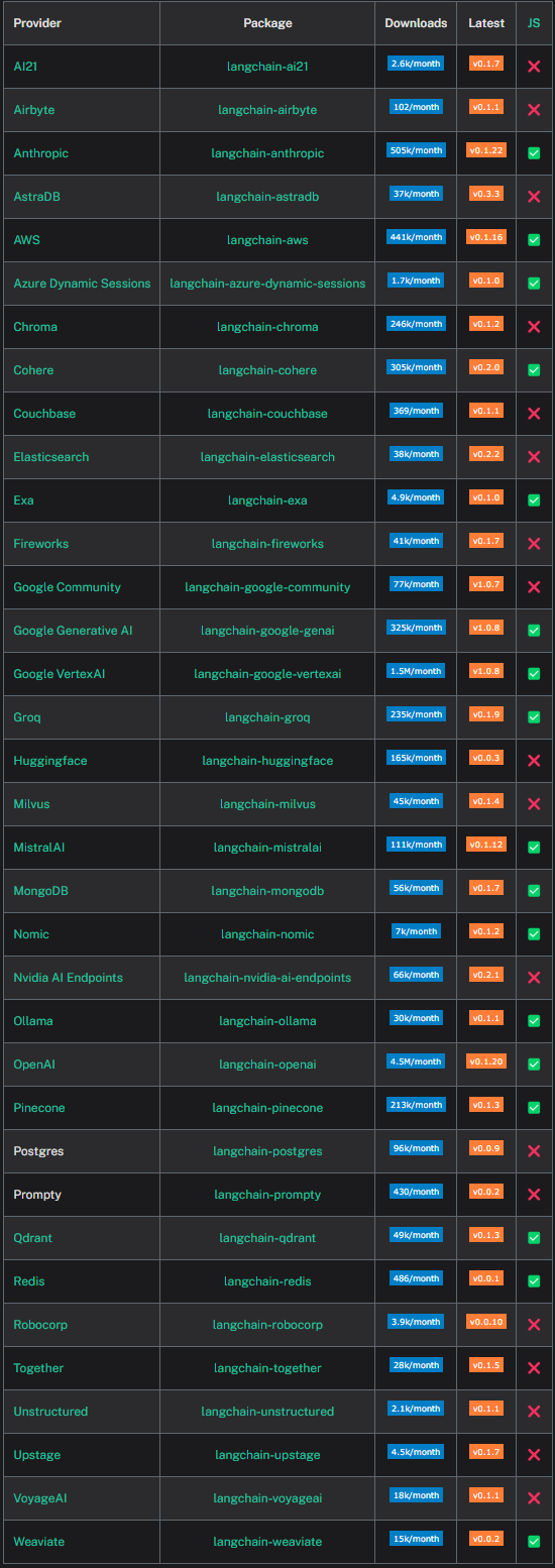 | 파트너 패키지 | 특정 통합을 위한 경량 패키지(e.g., langchain-openai) |