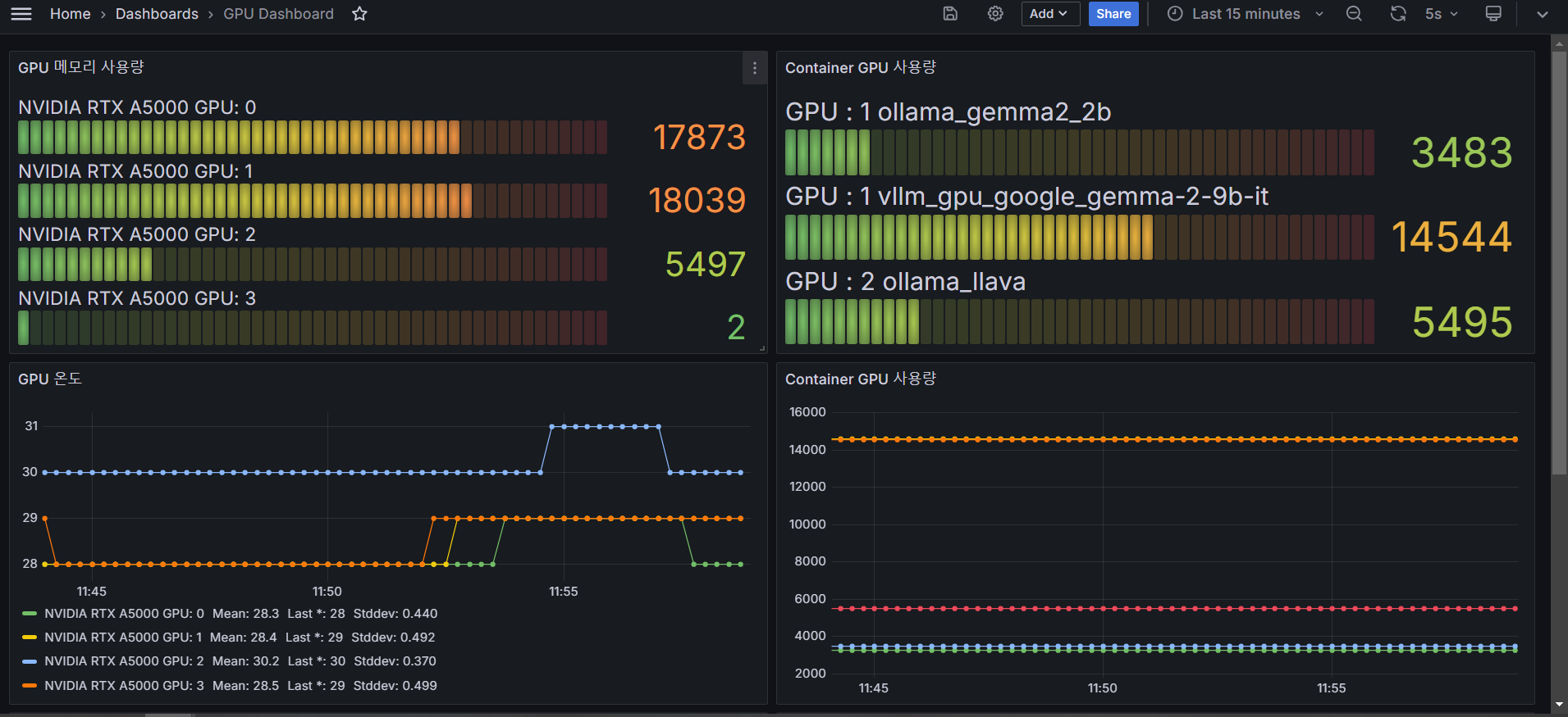 grafana를 활용하여 nvidia 에서 cuda 에 대한 메모리 확인과 각 container 별로의 gpu 사용량을 측정하게 하였습니다.