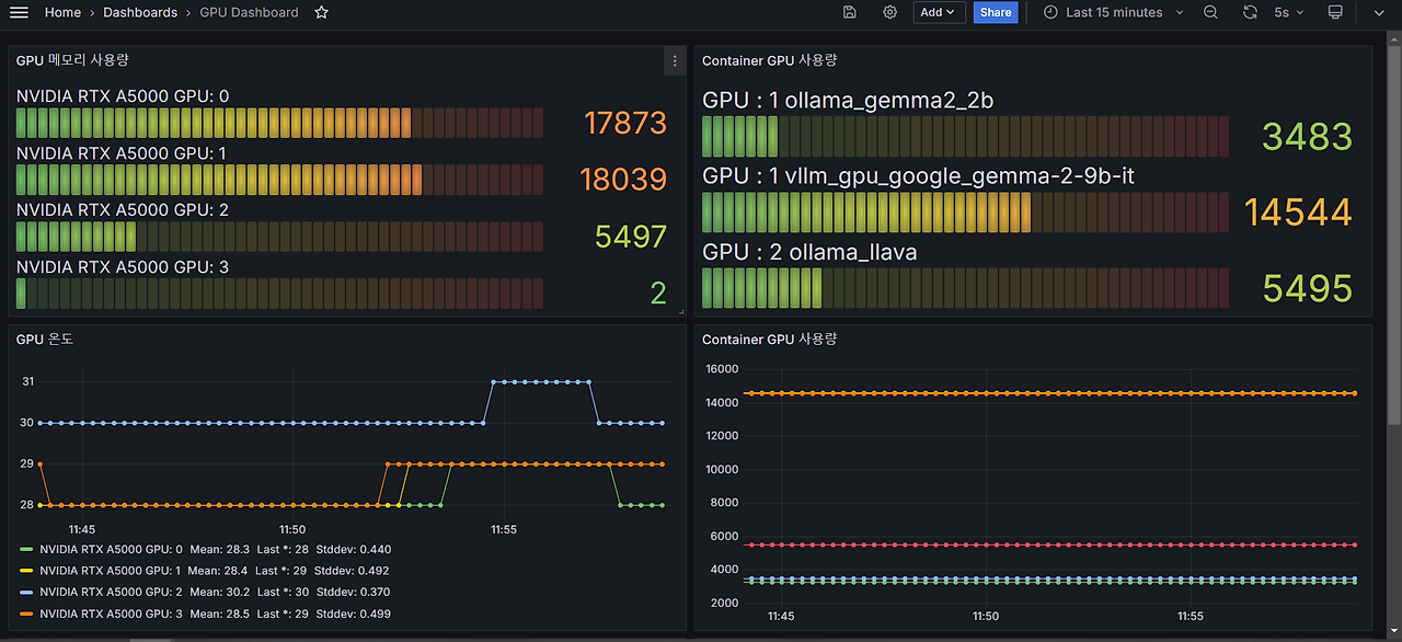 - 컨테이너 이름과 GPU ID에 따른 메트릭 수집: 각 컨테이너 이름과 GPU ID를 기준으로 GPU 메모리 사용량을 기록하고, 이를 Prometheus로 전송하여 Grafana에서 시각화할 수 있습니다.