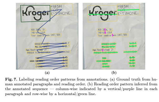 Fig. 7에서 볼 수 있듯이, 데이터 라벨링은 인간이 주석으로 정의한 문단과 읽기 순서를 기반으로 합니다. (a) 이미지는 사람이 직접 정의한 문단과 읽기 순서의 주석을 보여주고 있으며, (b) 이미지는 주석된 데이터를 기반으로 모델이 추론한 읽기 순서를 보여줍니다. 각 문단의 읽기 순서는 수직 패턴(보라색 선)과 수평 패턴(녹색 선)으로 나타내며, 이를 통해 문서의 읽기 순서를 더욱 명확하게 정의합니다.