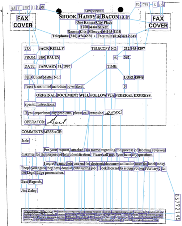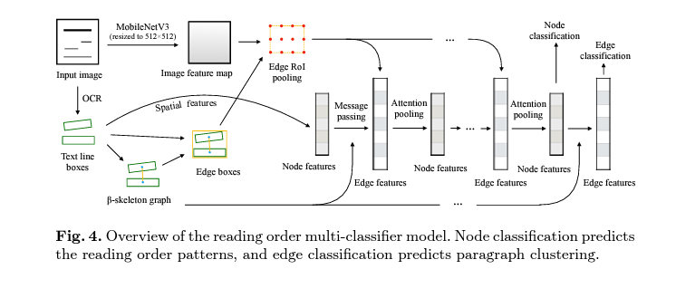 - 엣지 예측: 텍스트 상자 간의 **엣지(연결선)**를 정의하여, 두 텍스트 상자가 같은 문단에 속하는지 여부를 판단합니다. 이 예측을 통해 문서의 각 텍스트 상자가 어떻게 연결되어 읽혀야 하는지를 결정하게 됩니다.