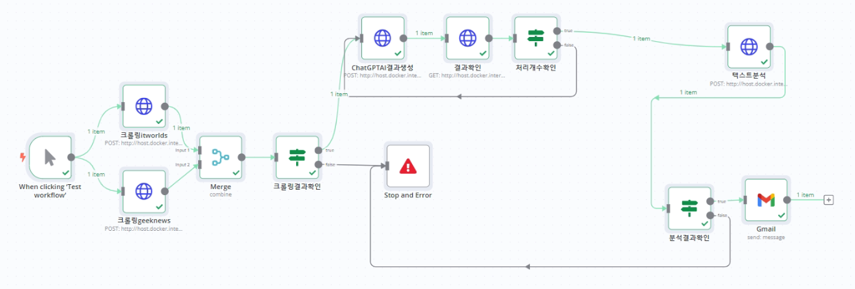 해당 워크플로우를 통해서 자기가 원하는 사이트에 대해서 크롤링을 하고, 주기적으로 GPT를 통해서 내용을 요약하고 내용에 대해서 텍스트 분석을 수행할 수 있었습니다.