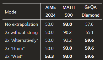 - 하지만 연구진이 "Wait" 토큰을 추가하여 모델이 계속해서 사고하도록 유도함.