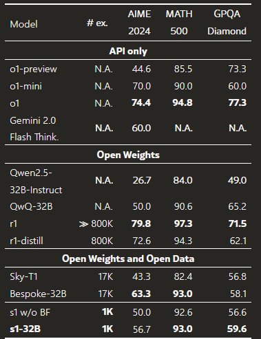 - 소규모 데이터셋(1,000개 샘플)과 간단한 기법(Budget Forcing)만으로 강력한 추론 성능을 달성