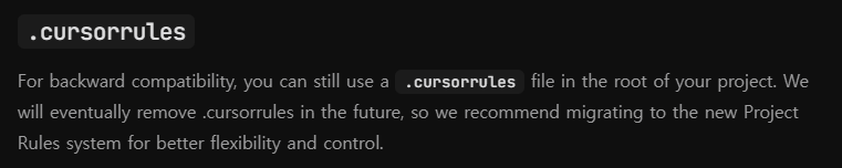 내용을 확인해보니,곧 없어질 수 있다고 하고 새로운 구조인 .cursor/rules 구조로 변경해서 관리해야할 것 같습니다.