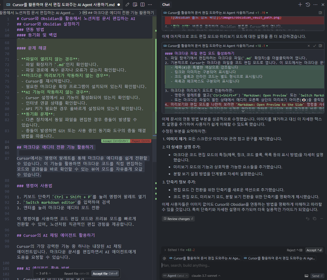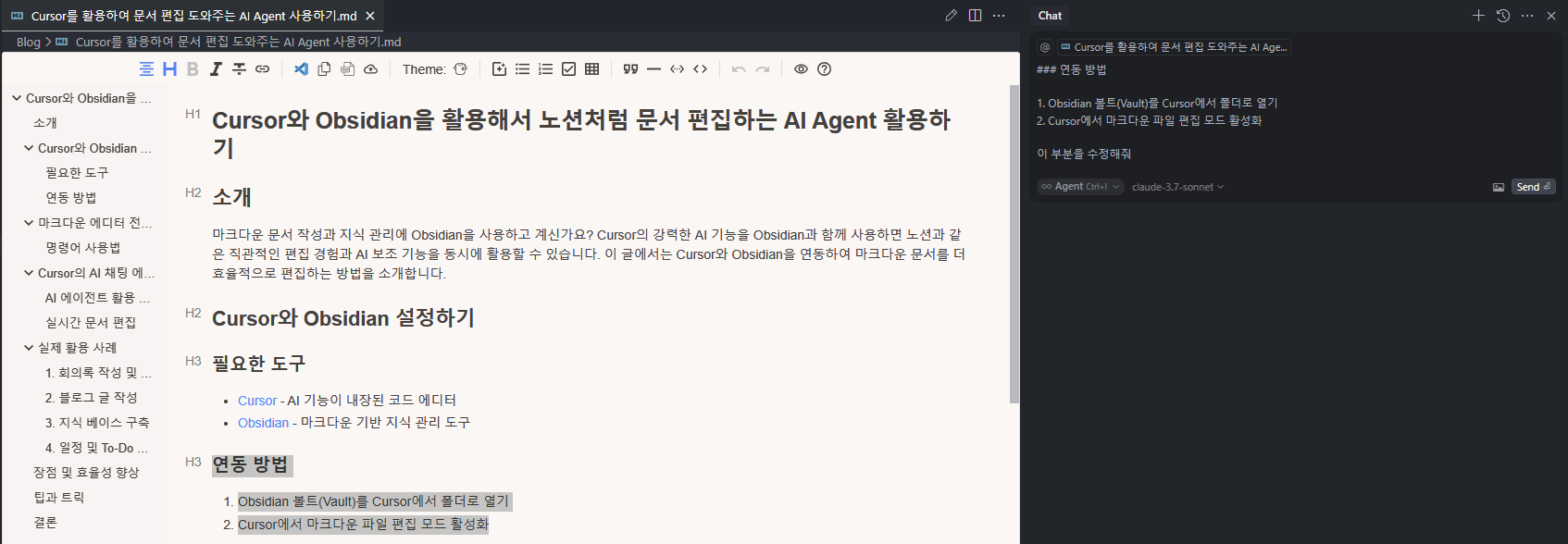 Cursor의 마크다운 에디터 전환 기능과 AI 채팅 에이전트를 활용하면, Obsidian에서 작성하는 문서를 노션과 같은 직관적인 환경에서 편집하면서도 AI의 강력한 지원을 받을 수 있습니다.