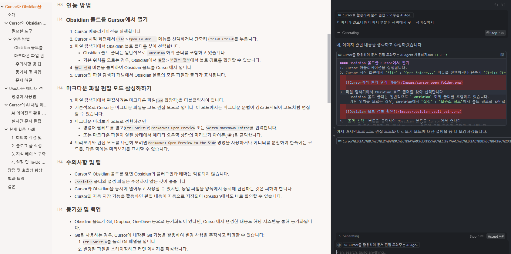 이러한 조합은 Obsidian의 강력한 지식 관리 기능과 Cursor의 AI 기반 편집 기능을 결합하여, 더 효율적이고 생산적인 문서 작업 환경을 제공합니다.