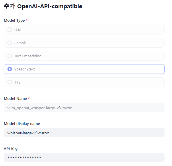 dify에 open-source 모델에 vllm openai-compatible 하게 서빙을 한 stt 모델을 테스트하는 데, 자꾸 영어로 변환되는 문제가 발생했다.