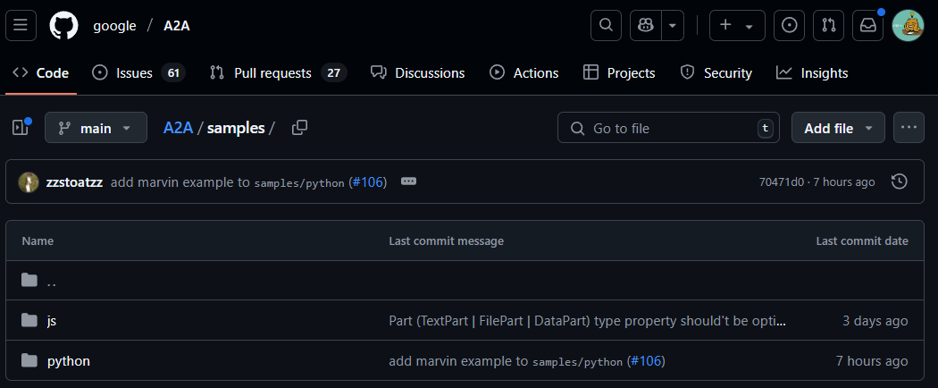 여기서는 예시로 요즘 핫한 a2a 예시 코드가 있는 https://github.com/google/A2A 에서 가져오는 걸로 하겠습니다.