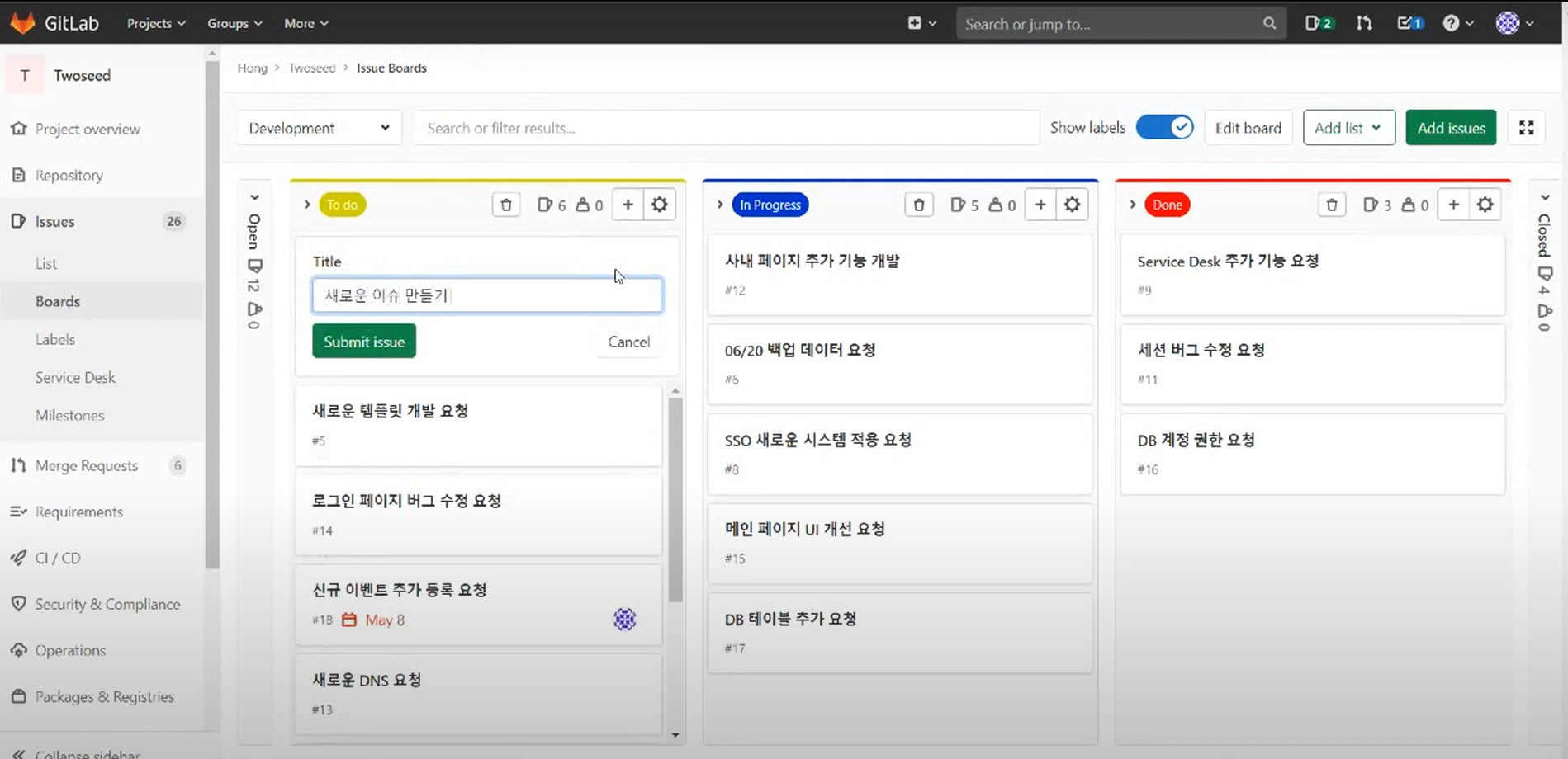 GitLab에서는 이슈들을 보드 형식(Board View)으로도 볼 수 있어요.