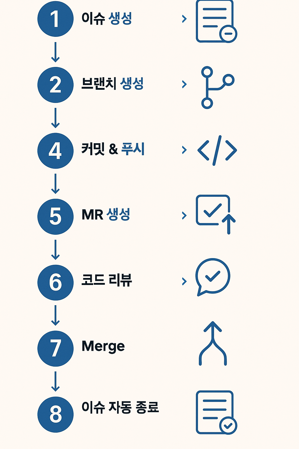 - 팀 내부에서 Issue를 기반으로 개발을 시작해 MR까지 이어지는 전체 작업 흐름을 기록하고