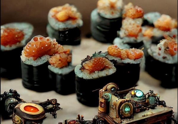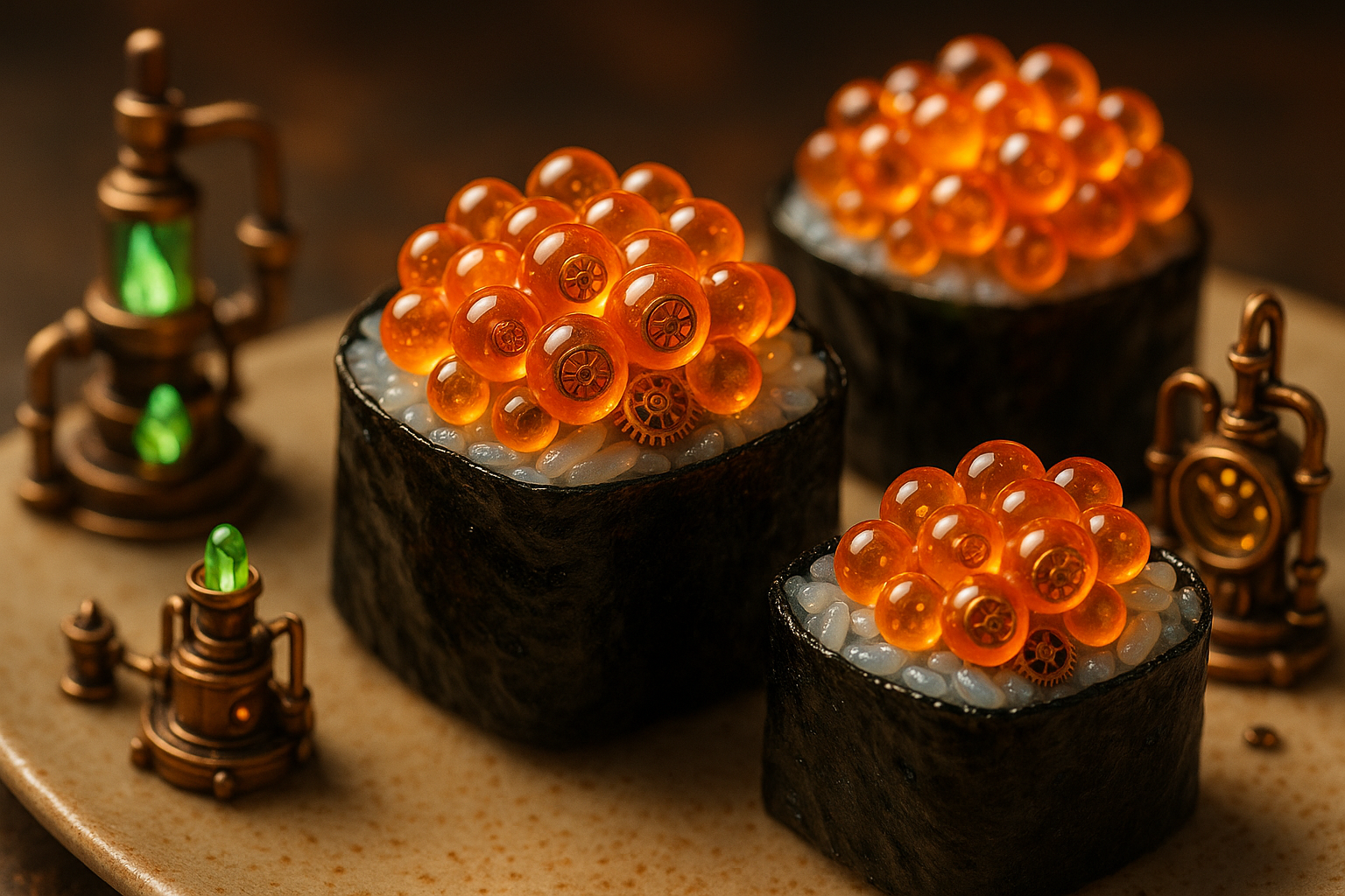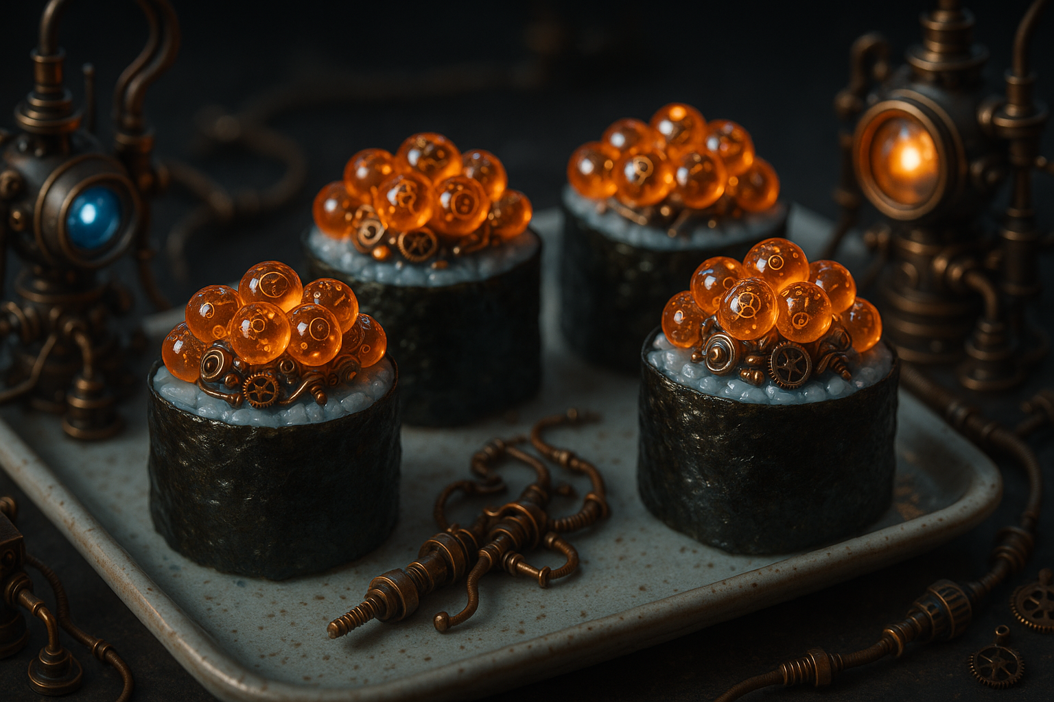 (masterpiece:1.5), futuristic steampunk sushi rolls topped with glowing mechanical salmon roe, translucent orange pearls embedded with tiny gears and copper wires, blue-tinted sushi rice wrapped in dark seaweed, placed on a ceramic lab tray, surrounded by miniature steampunk machines with glowing lenses, tubes, brass fixtures and rotating gears, cinematic lab-like lighting, 45-degree macro close-up angle, ultra-detailed surreal food concept | blurry, extra limbs, messy composition, unrealistic lighting, cartoon texture, plastic look