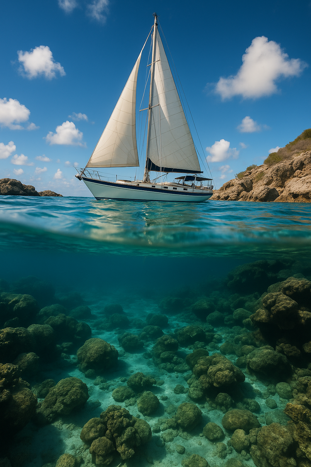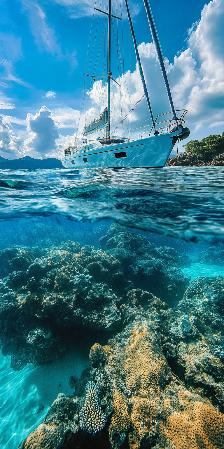 | Beautiful sailboat, with a half-underwater view of the yacht in crystal-clear water, surrounded by rocks and corals. The scene is set on a sunny day with a blue sky. This award-winning photograph was taken by David Mohrbacher and published in National Geographic. This is an example of stunning landscape photography, captured with a Nikon D850 camera. | (masterpiece:1.3) split-view shot with the waterline perfectly centered, upper half shows a sleek modern sailing yacht floating on crystal-clear tropical water under a vivid blue sky with soft clouds, sunlit white hull casting reflections on the surface, lower half reveals a vibrant coral reef teeming with colorful fish and rich textures, warm tropical sunlight filtering through water creating shimmering caustics and light rays, sharp focus on the contrast between above and underwater worlds, ultra-realistic digital photography aesthetic, camera perfectly aligned at mid-waterline for balanced framing | blurry waterline, low detail coral, distorted reflections, unnatural light scatter, plastic textures --ar 2:3 --v 6 --style raw --quality 2 --seed 720315 |