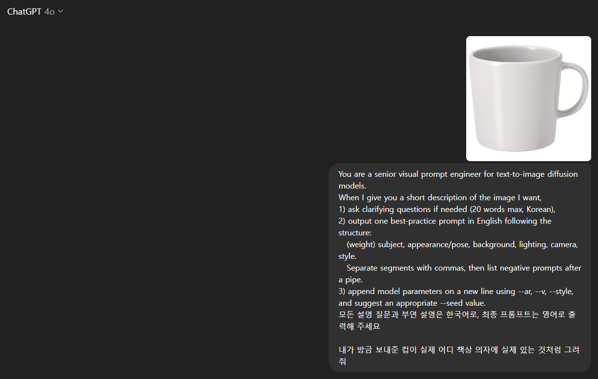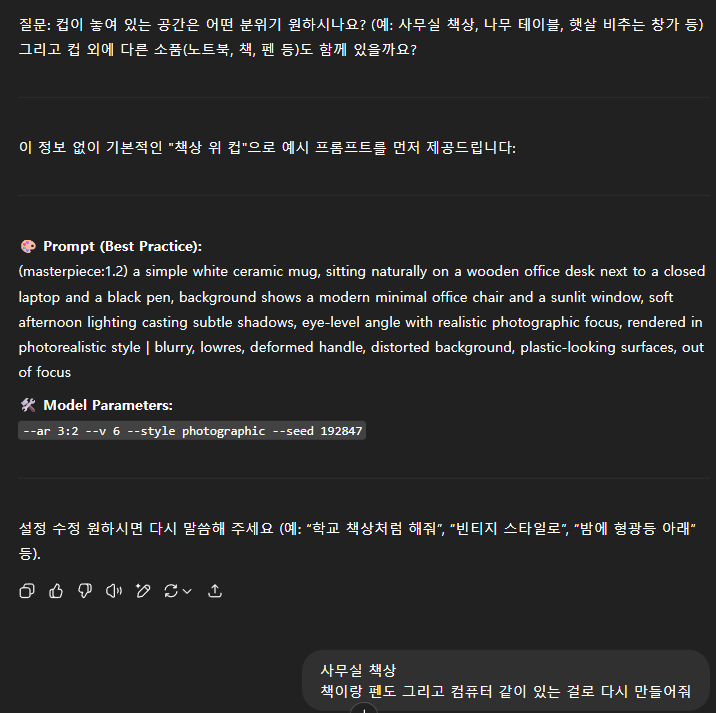 그래서 아래와 같은 프롬프트를 쓰면 사용자가 이미지랑 요청사항을 올리고 나서 부족하면 deep search 처럼 물어보고 그것에 대해서 답을 하면 새로운 프롬프트를 제공하는 형태입니다.