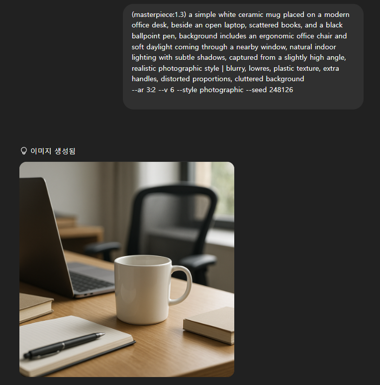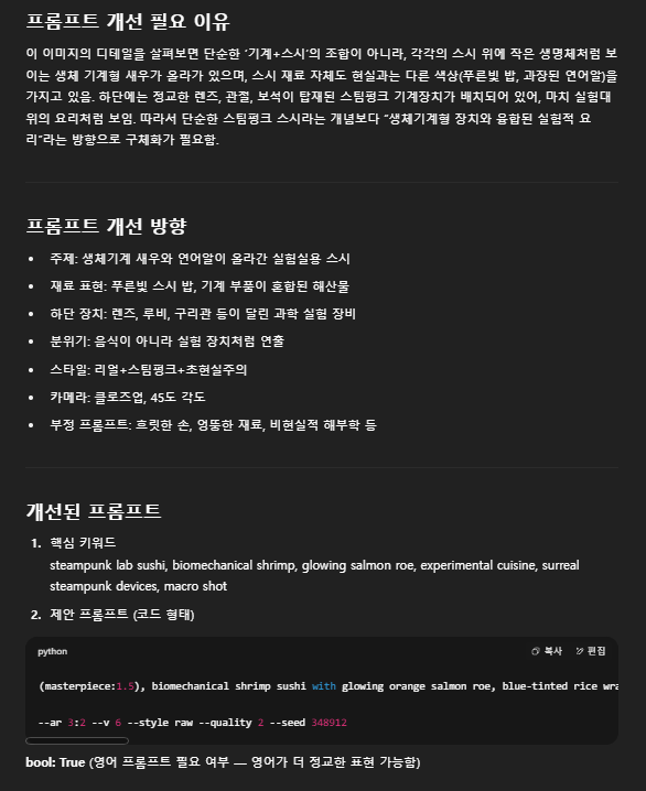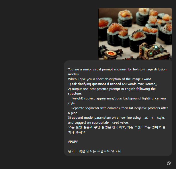 왼쪽에 내가 만들고 싶은 사진에 대해서 그림과 기존에 이미지 생성 메타 프롬프트 그리고 자체적으로 설정해놓은 프롬프트 최적화 명령어를 추가하고 위 그림과 동일하게 만드는 프롬프트를 요청해봤습니다.