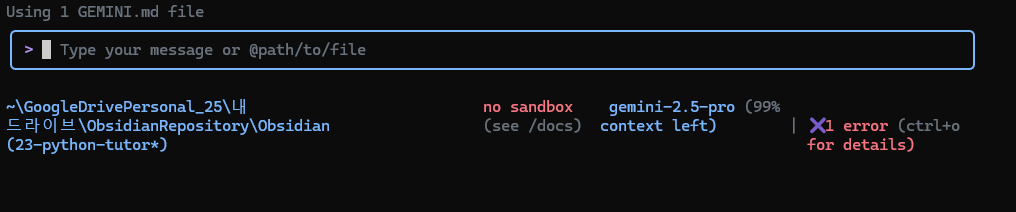 그러면 내 파일이 있는 곳에 바로 GEMINI를 킬 수 있고 GEMINI.md를 항상 고정해서 적용할 수 있습니다.