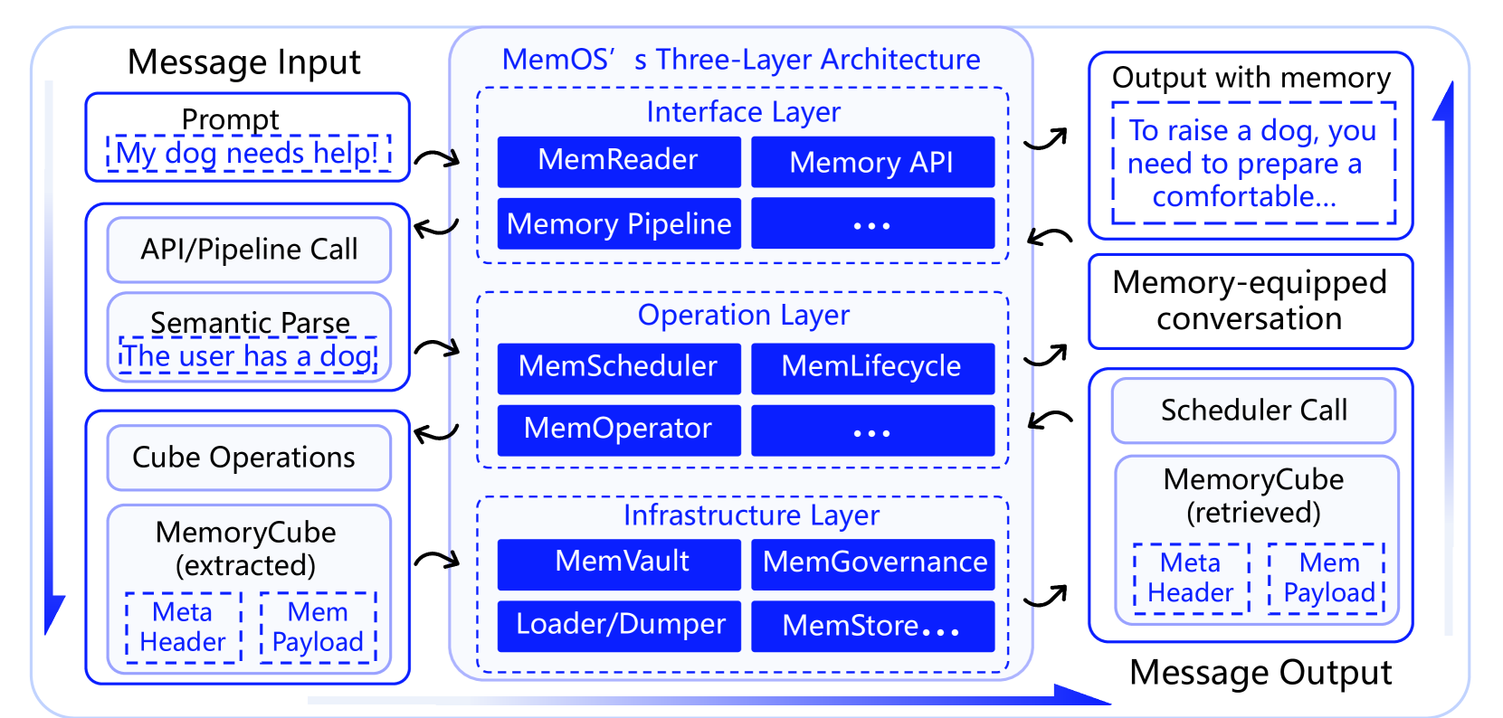MemOS는 **운영체제(OS)**의 메타포를 충실히 따르는 3계층 구조 아키텍처로 설계되었습니다linkedin.com. 각 계층은 다음과 같은 역할을 맡습니다: