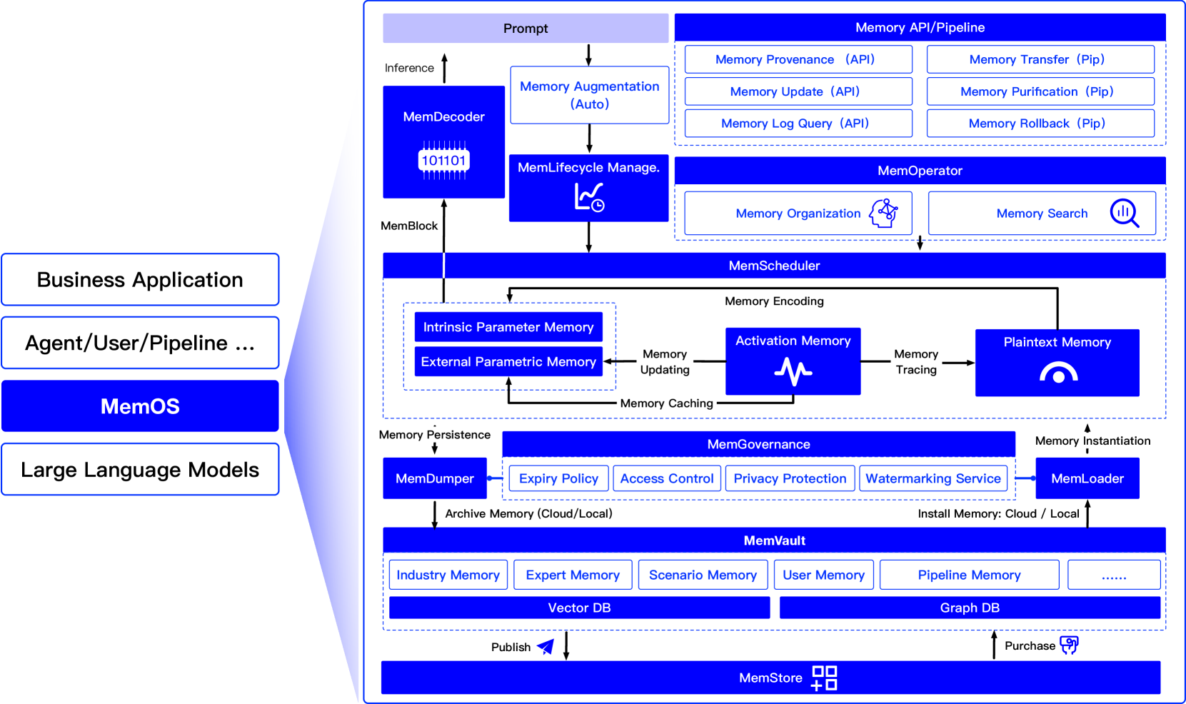 - 운영체제: 컴퓨터 OS가 메모리를 계층적으로 관리(예: 캐시, RAM, 디스크)하고 프로세스 간 자원을 분배하듯이, MemOS도 계층적인 메모리 관리를 도입합니다arxiv.org. 예를 들어, 작업 기억(working memory)에 해당하는 부분은 빠르게 접근할 수 있지만 용량이 제한되고, 장기 저장소는 방대하지만 느릴 수 있습니다. MemOS는 상황에 따라 어떤 정보를 유지하고 압축하거나 버릴지 스케줄링하고, 필요한 순간에 적절한 기억을 미리 불러오거나(preloading) 주입하는 역할을 합니다memos.openmem.netmemos.openmem.net. 이를 통해 LLM이 항상 최적의 맥락 정보를 갖고 동작하도록 조율하는 것입니다.