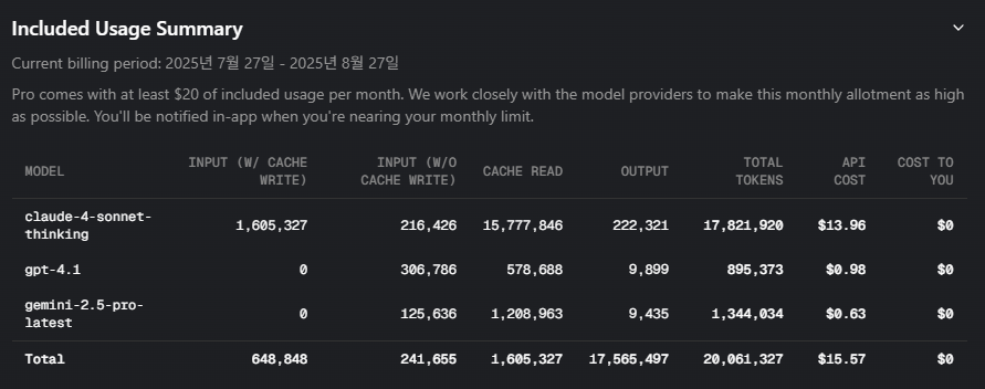 요즘 cursor를 쓰고 있는데, 예전과 달리 정말 기본 제공이 하루나 이틀 사이에 다 쓰는 경험을 하였습니다.