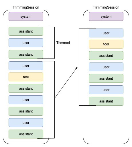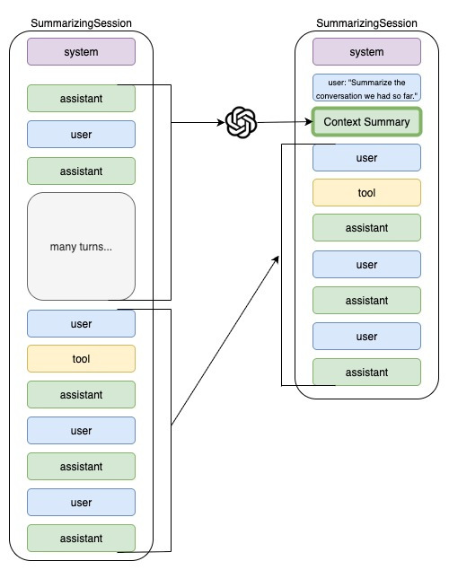 이 문서는 ‘긴 대화 속에서 AI가 필요한 것만 기억하고, 불필요한 정보는 버리거나 압축해 효율적으로 대화를 이어가도록 하기 위한 컨텍스트 관리 전략(트리밍 vs 요약)과 그 구현 방법(TrimmingSession / SummarizingSession)을 설명하는 가이드