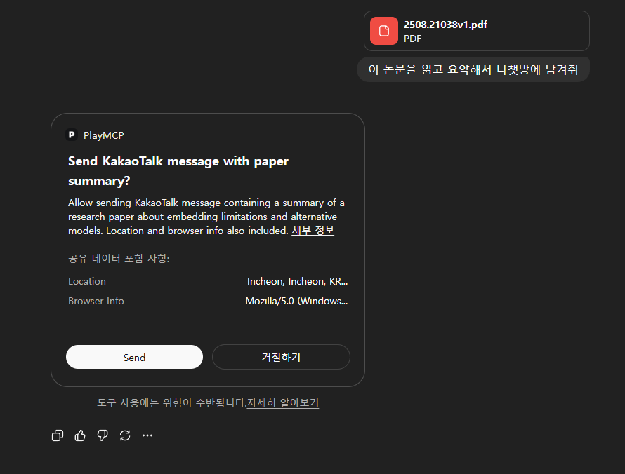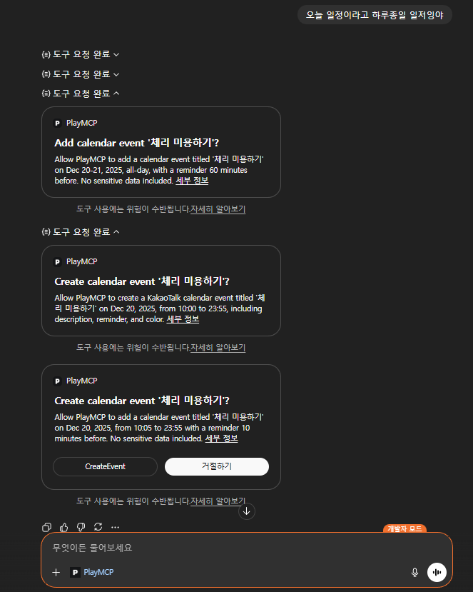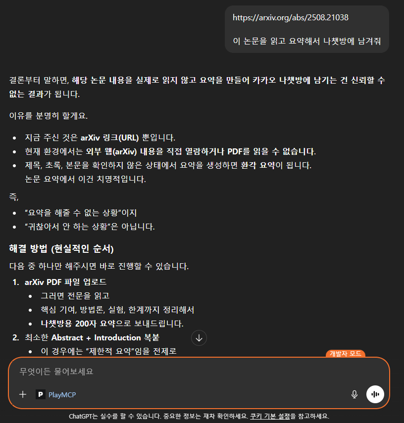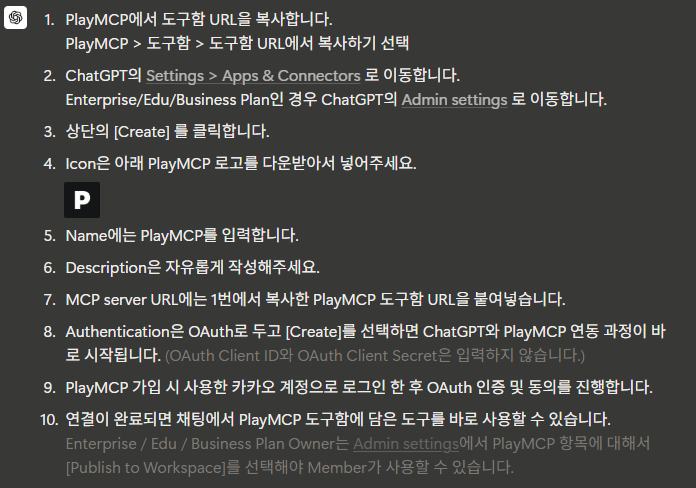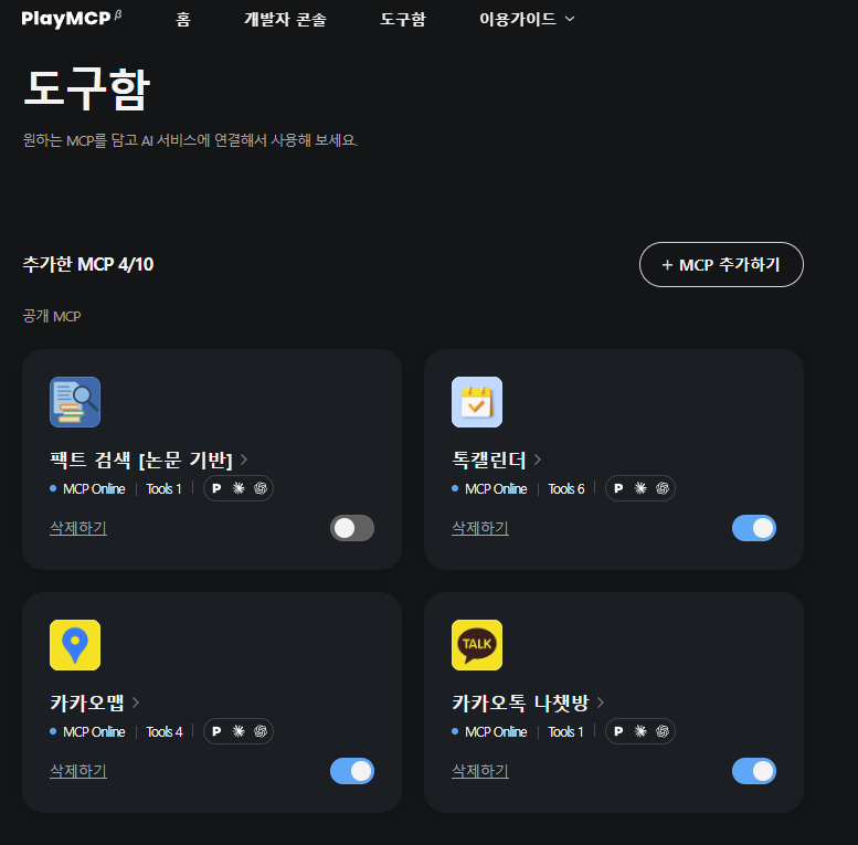 앞으로 더 나아지겠지만, PlayMCP에 대해서 알아보았고, ChatGPT에서 PlayMCP랑 기존 툴을 호환되게 쓸 수 있게 된다면 더 유용할 것 같다.