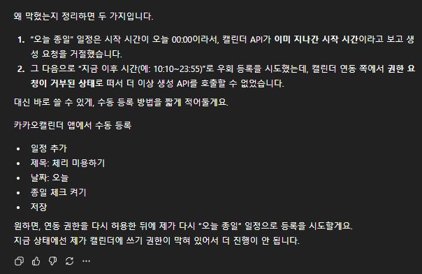 툴이 하나 연계되다보니, 기존에 CHATGPT가 가진 웹검색 기능이 동작하지가 않는다.
