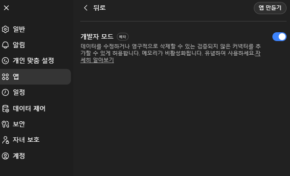 1. 우선 앱에서 고급설정을 누르면 개발자 모드를 활성화해야한다.
