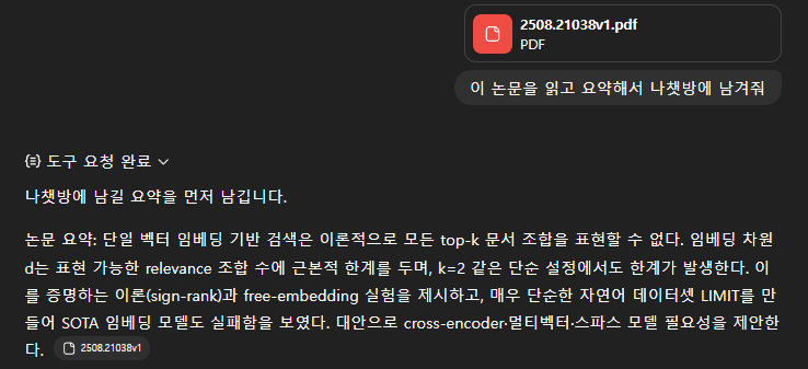 그 다음 평소에 나는 나챗방에 링크를 모아두고 나중에 시간이 되면 보는데, 이제는 바로 CHATGPT한테 보낸 다음에 그 내용을 정리해주는 지 테스트 해봤다.