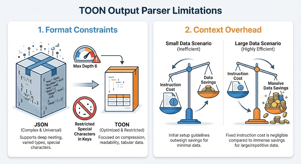 TOON은 강력한 비용 절감 도구이지만, 모든 상황에서 완벽한 '은탄환'은 아닙니다. 현재 단계에서 사용자가 인지해야 할 주요 제약 사항과 비용 구조를 정리했습니다.