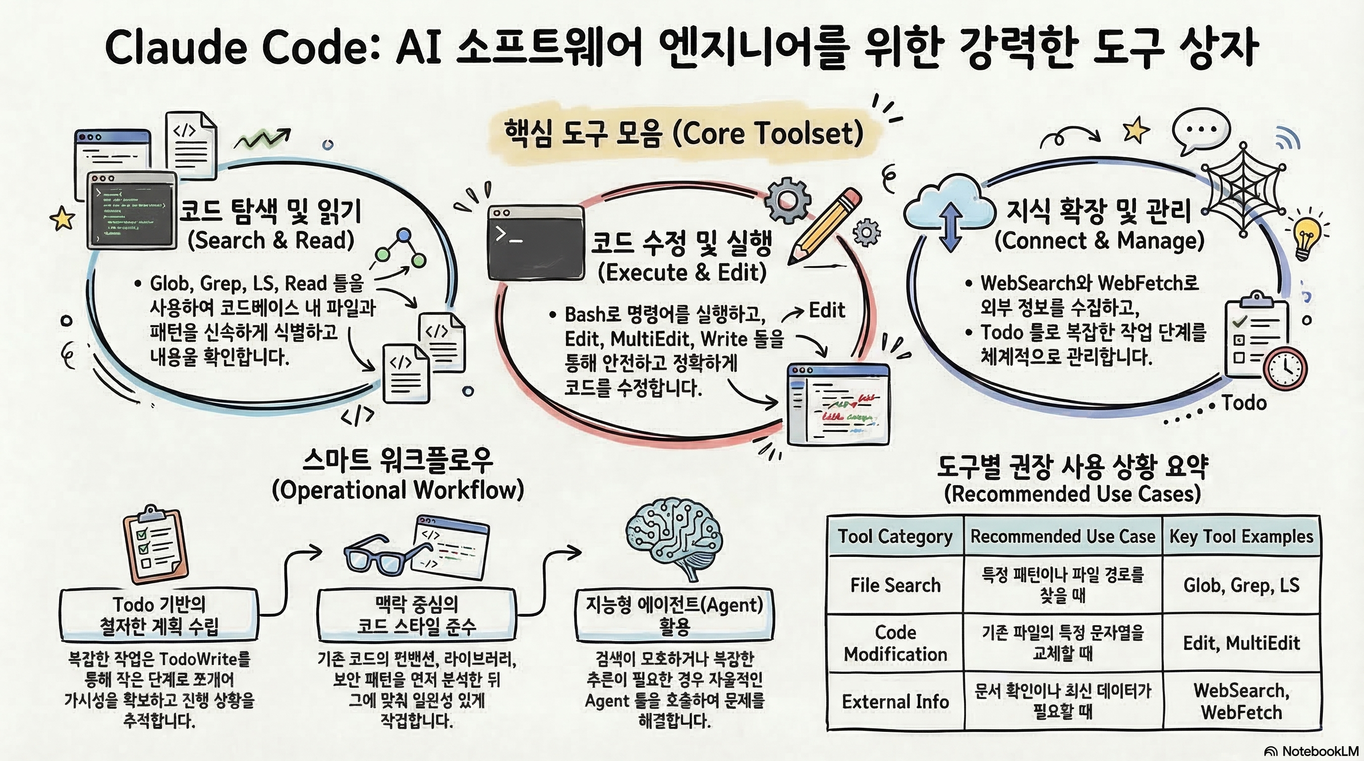 이 구조의 핵심은 모델 자체의 지능에 의존하는 것이 아니라, 작은 도구들을 조합하여 작업을 수행하도록 만드는 것이다.
