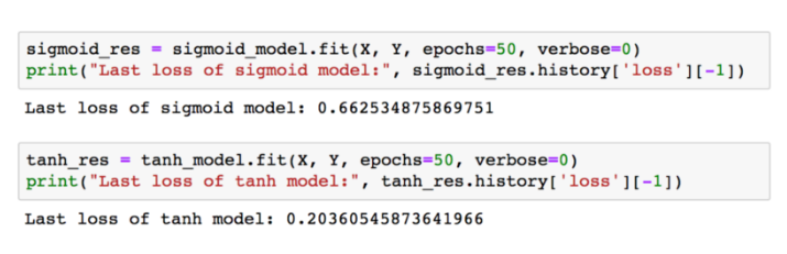 실제 training을 해보면 sigmoid 보다 tanh 모델의 loss가 훨씬 더 같은 에폭에서 잘 떨어진 것을 알 수 있습니다