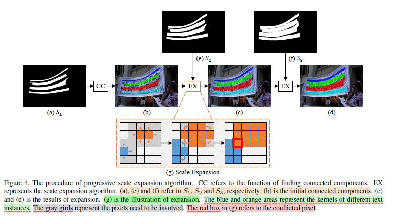 2. progressive scale expansion 방법을 쓴다. 이것을 하면 d)처럼 인근을 잘 잡을 수 있다.