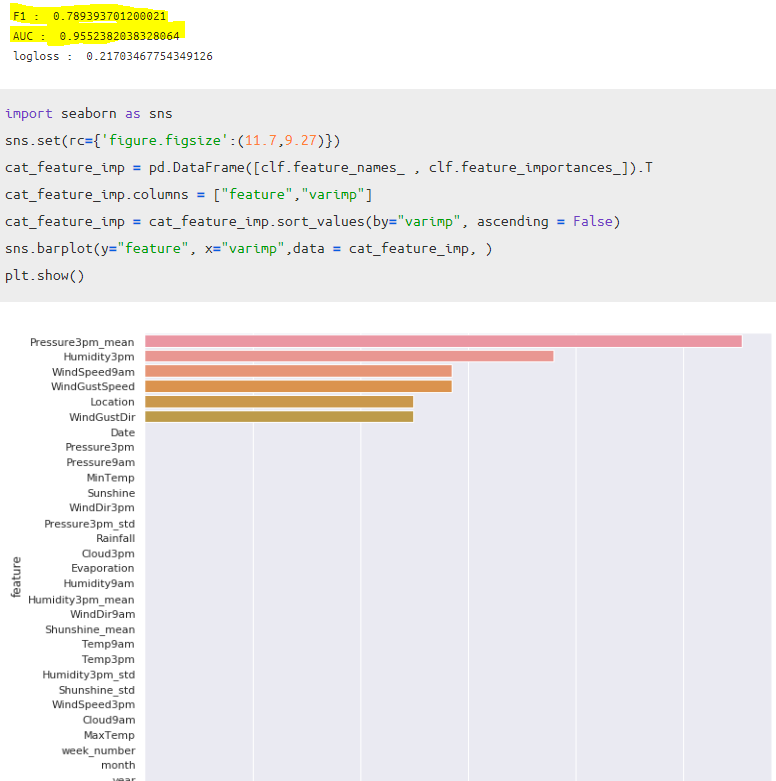 - 그래도 Humidity3pm , WindGustSpeed , Pressure3pm 관련 변수 이렇게가 둘다 나오는 것을 보니 확실히 2개는 먼가 중요한 영향을 끼치는 변수 인 것 같다.