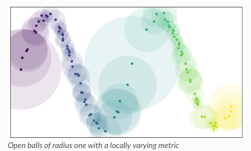거리의 개념이 다양체 전체에서 다양하기 때문에 단순히 데이터를 균일하게 분포시키지 않은 것처럼 보이는 경우 - 공간 자체가 왜곡됩니다. 즉 데이터가 더 고밀도 또는 고밀도로 나타나는 위치에 따라 늘어나거나 줄어듭니다.