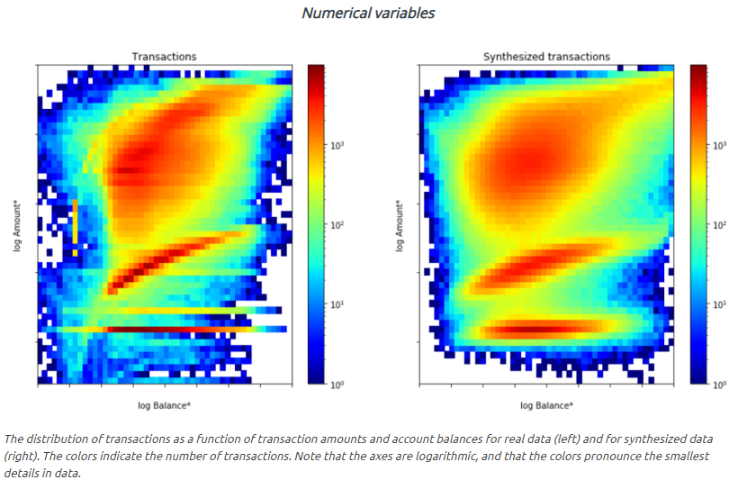 위 그림은 거래금액과 계좌 잔액의 함수로서 거래 건수를 나타낸다. 이 데이터는 서로 다른 금액의 거래에 해당하는 세 개의 우세한 지역(그림의 '빨간' 지역)을 분명하게 보여준다. 이 세 영역은 합성에서 정확하게 생성되며, 영역의 모양에서 알 수 있듯이, 합성도 변수 사이의 공분산을 캡처한다!