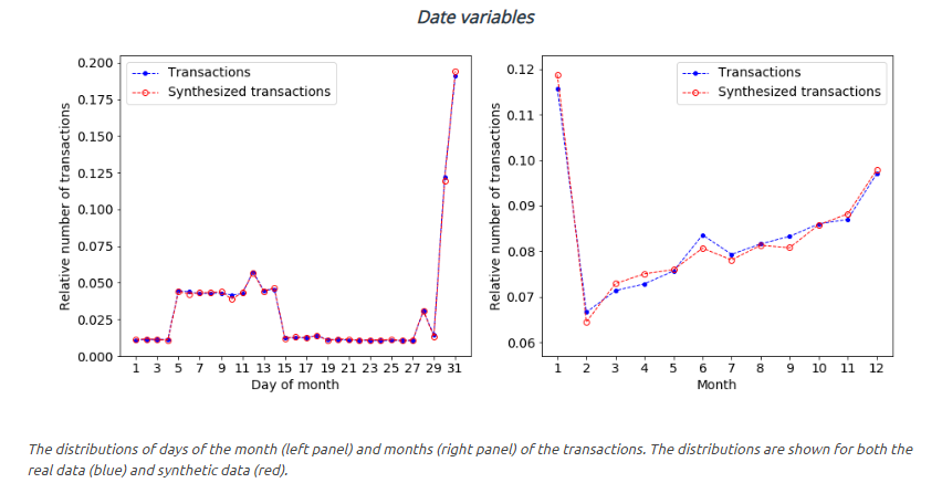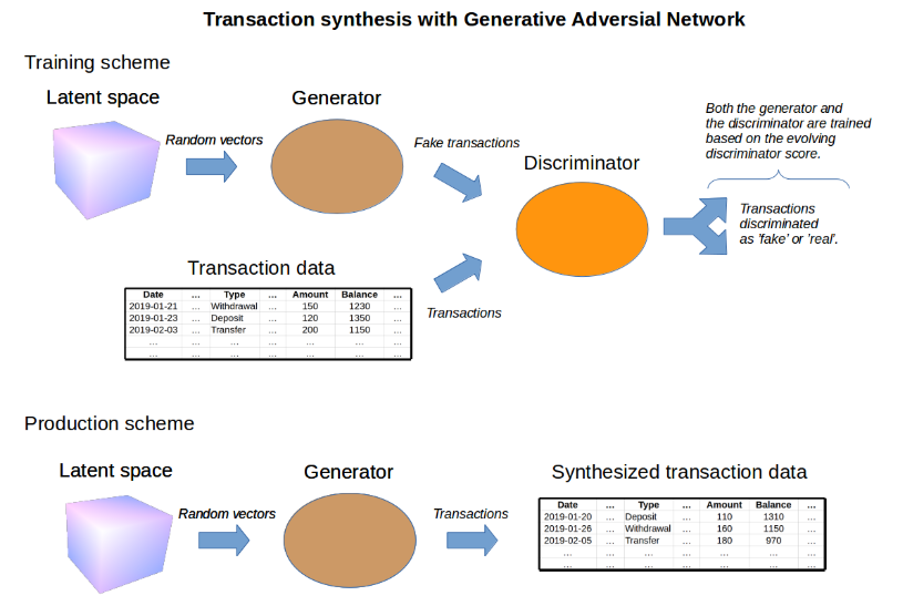 GAN은 서로 다른 범주 간의 상대적 수치, 거래 일자 분포, 거래 금액과 계좌 잔액의 분포를 보존하는 등의 특성을 가진 합성 데이터를 생성하는 데 성공한다.