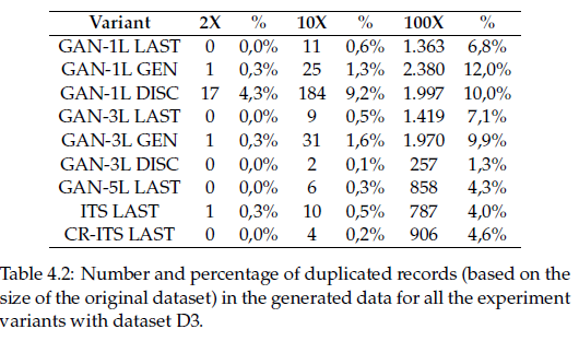 수집된 전체 지표에서, 생성된 중복된 합성 기록의 수와 실제 데이터 세트에서 반복된 합성 기록의 수를 확인하는 것이 주목할 만했다. D1과 D2는 어떤 실험에서도 중복되거나 반복된 기록은 없었다.