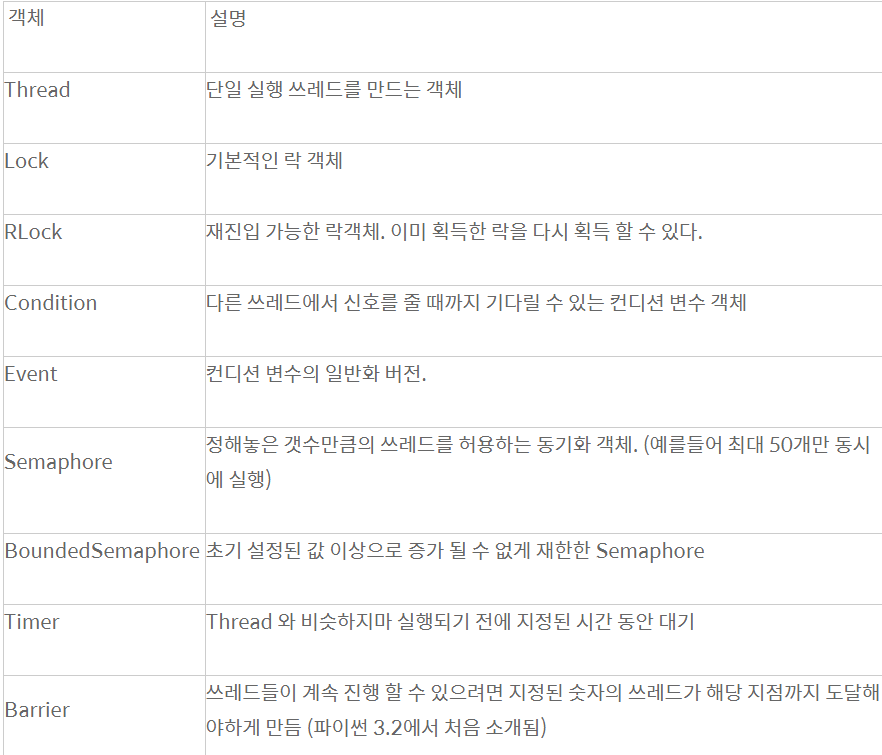 파이썬에선 GIL이 존재함 ( 한 순간에 하나의 스레드만 작동하도록 만드는 것 ) 즉 CPU가 여러 개 있어도 하나만 사용하게 함. 스레드를 해당 순간에 하나만 사용해서 락이 필요 없어 보이지만, 문제가 생길 수 있어서 Lock Event 같은 객체가 있음.