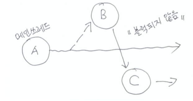메인 쓰레드 (A)는 자기가 하는 일만 하고 B 에게는 알아서 B -> C -> Result