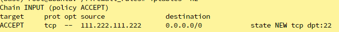 -A INPUT -s 111.222.111.222/32 -p tcp -m state --state NEW -m tcp --dport 22 -j ACCEPT