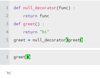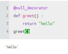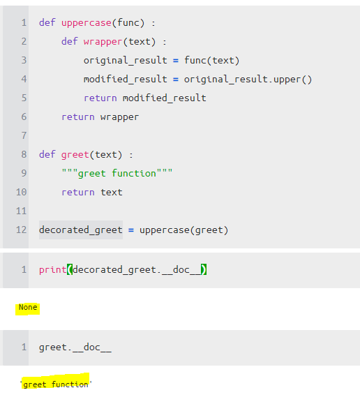 데코레이터를 사용하면 실제로 한 함수가 다른 함수로 교체되기 때문에 한 가지 단점은 일부 메타데이터를 숨겨버린다는 것이다. 여기서는 docstring이 사라진 것을 볼 수 있다.