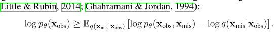 p_theat(x)가 x_mis에 대한 효율적인 marginalization을 인정하지 않으면, θ의 추정은 대개 아래와 같이 전자파 알고리즘 또는 보다 일반적인 접근방식을 사용하여 변동 하한선을 최대화함으로써 수행된다