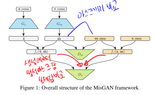 이 논문은 MCAR에 초점을 맞춰서 진행한다 그래서 2개의 생성자(G_x , G_m)는 각각에 대해서 독립적이다. 그리고 각자의 noise distribution을 갖고 있다. (각각 생성자와 마스킹이 의존적이 않아야 하는 구조가 좀 더 쉽게 납득할 수 있기 때문에 계속 MCAR을 강조하는 듯하다. 다른 논문도 MCAR을 가정하는데 의존적일 때는 어떻게 해야 할까 흐음...)